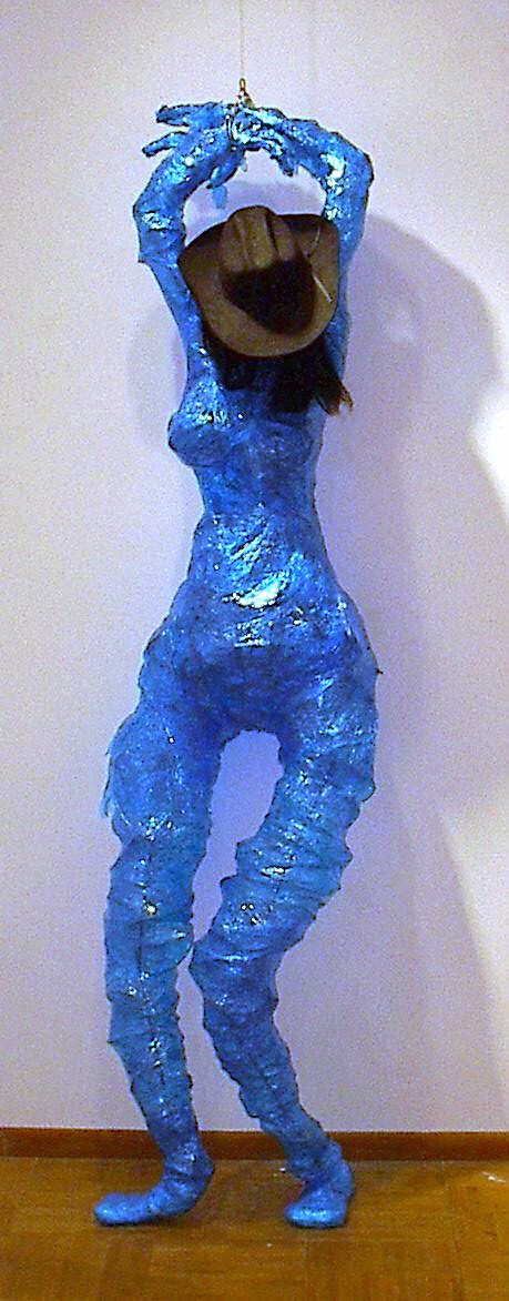 EXAMPLE OF WENDY'S ART DISPLAYED MAY & JUNE, 2001 AT WEINGART GALLERY, OCCIDENTAL COLLEGE, EAGLE ROCK (LOS ANGELES) CALIFORNIA --Blue Bondage Girl (coiled wire and saran wrap)